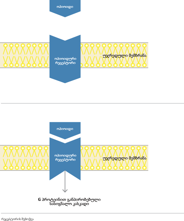 ნეირონებიდან ნეიროტრანსმიტერების გამოთავისუფლებას წინ უსწრებს ნერვული დაბოლოებების დეპოლარიზაცია და Ca++ ნაკადის შესვლა ვოლტაჟ-სენსიტიური Ca++ არხების მეშვეობით. ოპიოიდური რეცეპტორების შებოჭვას G პროტეინების აქტივაცია მოჰყვება. ამის შედეგად მცირდება კალციუმის არხების გახსნის ალბათობა და აგზნების დროს კალციუმის იონების ნაკადის ინტენსივობა. G პროტეინული აქტივაცია განაპირობებს ადენილატ ციკლაზას ინჰიბიციას, რის შედეგადაც იკლებს ციკლური ამფ-ის ფორმირება. ყოველივე ეს კი საბოლოოდ ამცირებს უჯრედის აგზნების ალბათობას.